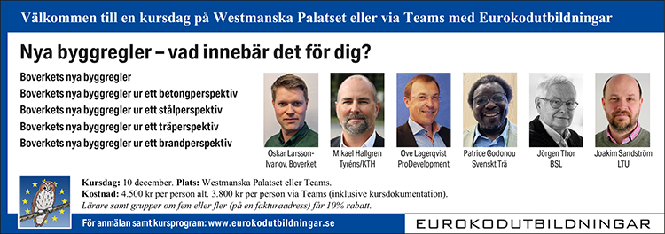 Till anmälanMissa inte Eurokodutbildningars seminarium för huskonstruktörer 10 december på Westmanska Palatset eller via Teams.